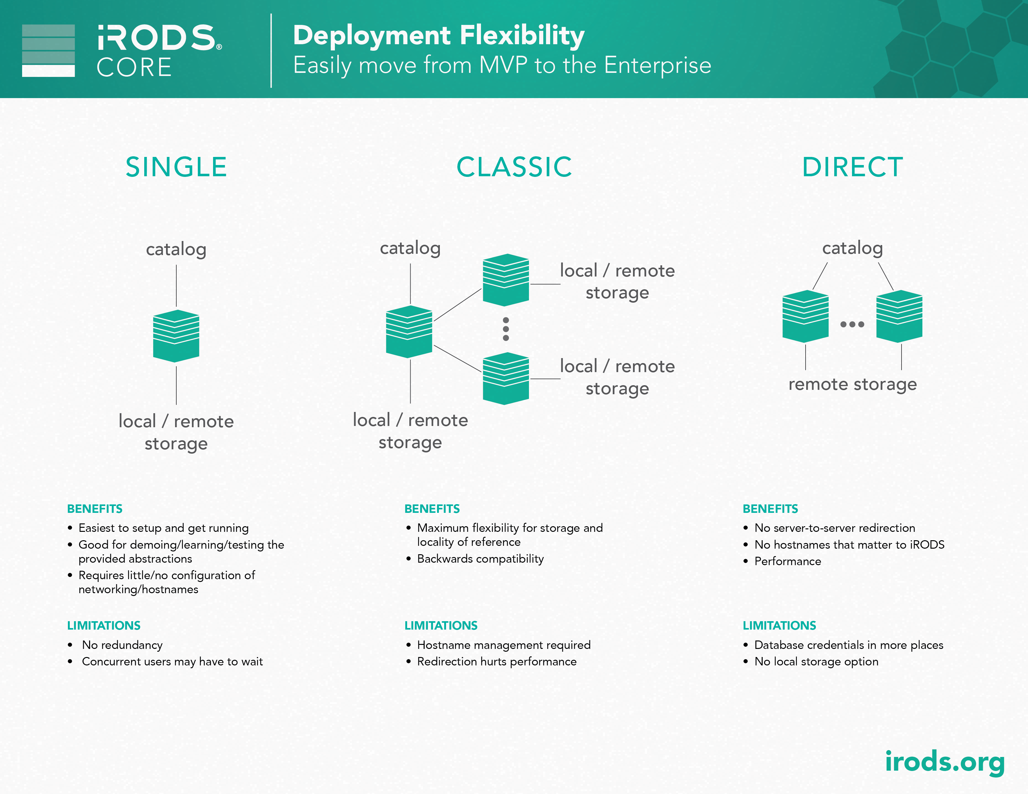 iRODS can fit the needs of many different organizations, from simpler, smaller deployments to more complex, dynamic configurations. From local storage and compute, up to scalable, remote, and high availability systems, iRODS can provide the stable backbone of your data management platform.