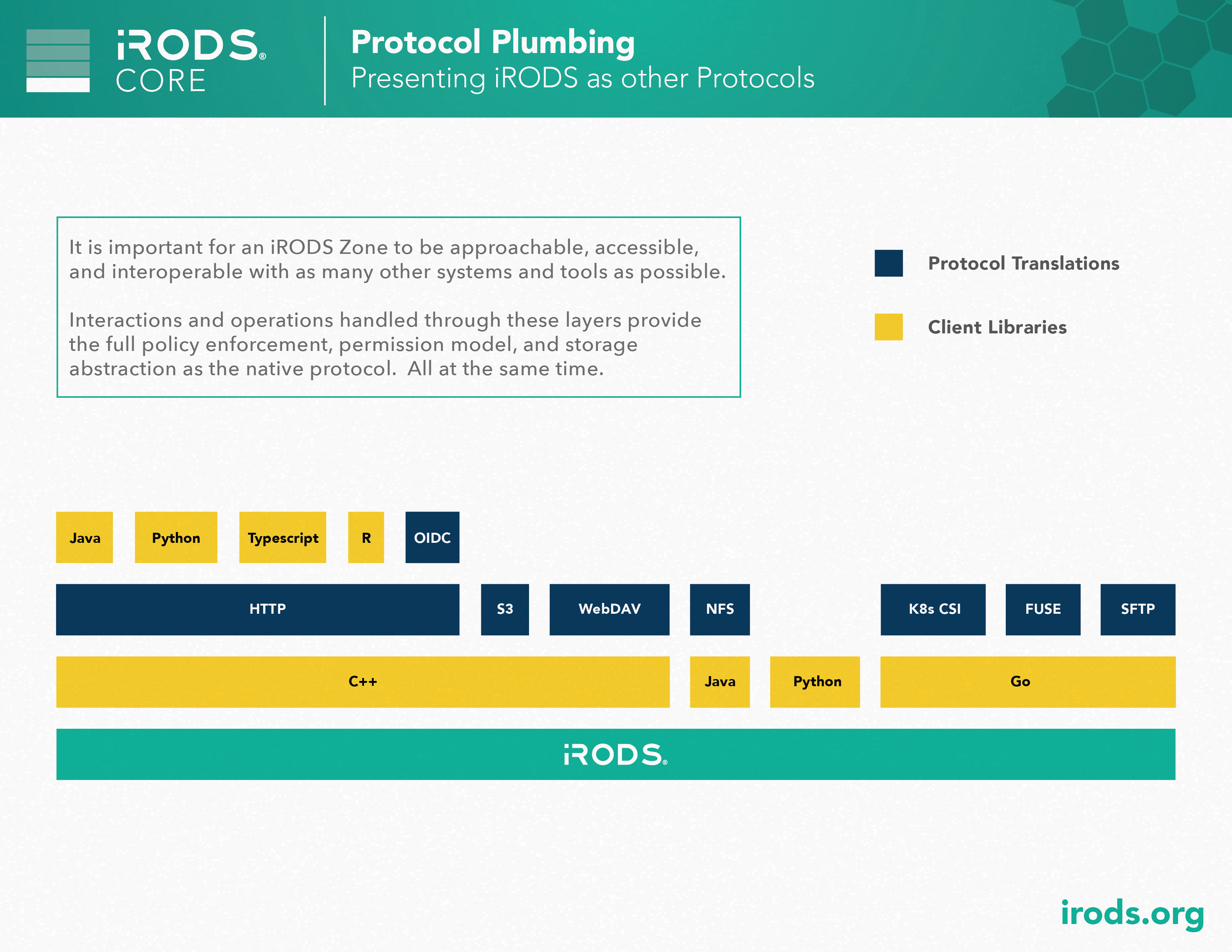 iRODS can be accessed through multiple different client protocols at the same time. In addition to the native iRODS protocol, clients can connect through NFS, WebDAV, S3, Kubernetes CSI, FUSE, SFTP, HTTP, and OpenID Connect.