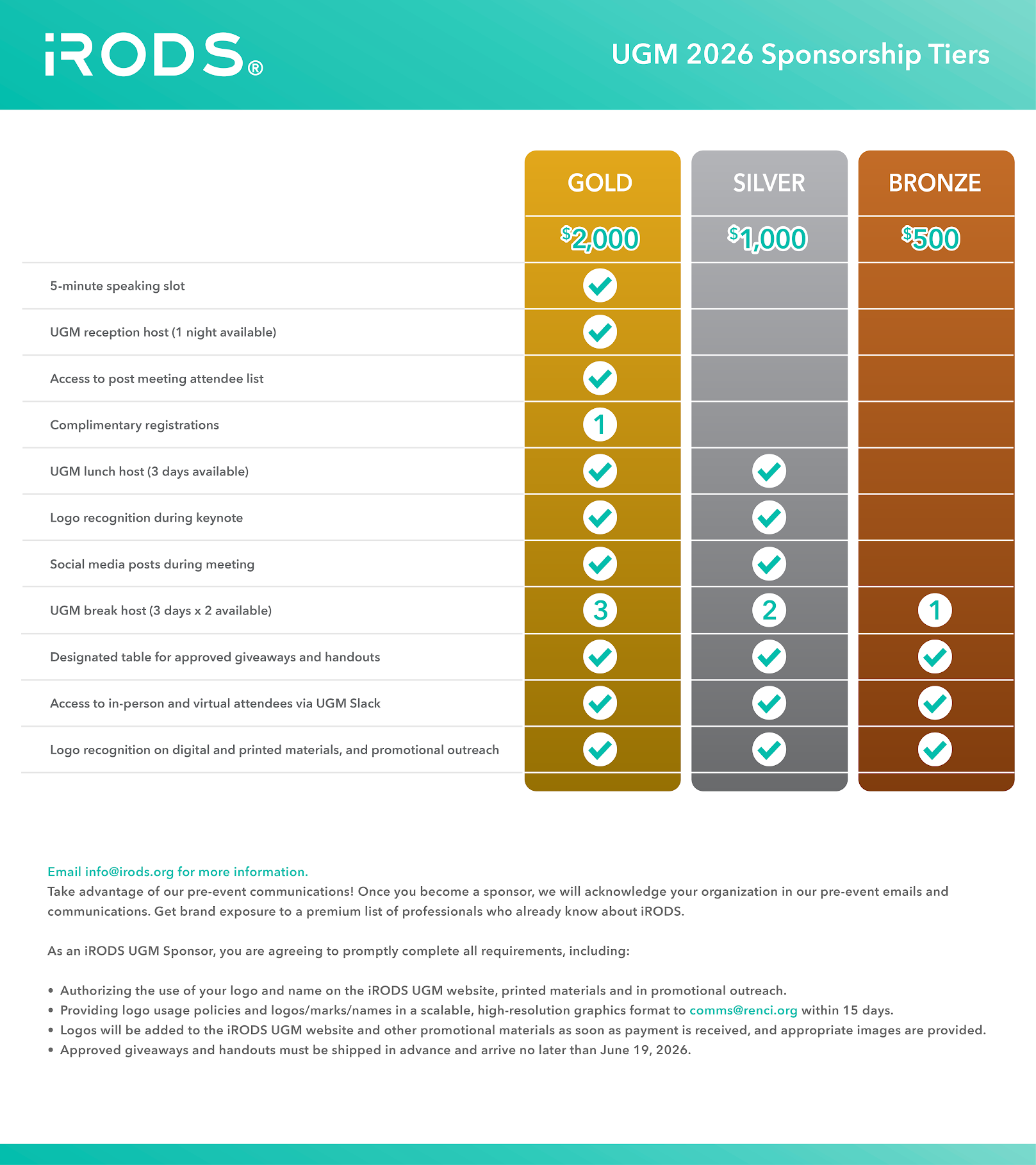 Contact us to set up your sponsorship for the iRODS User Group Meeting 2026.
